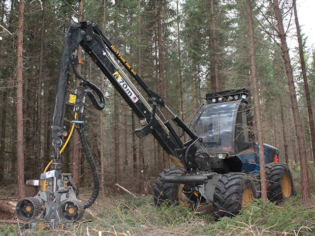 Skördaren är en Rottne H11, vi har två aggregat till maskinen. Det ena är ett sp451 som är till klen första gallring, det andra ett sp 561 som fungerar i gallring och slutavverkning.
